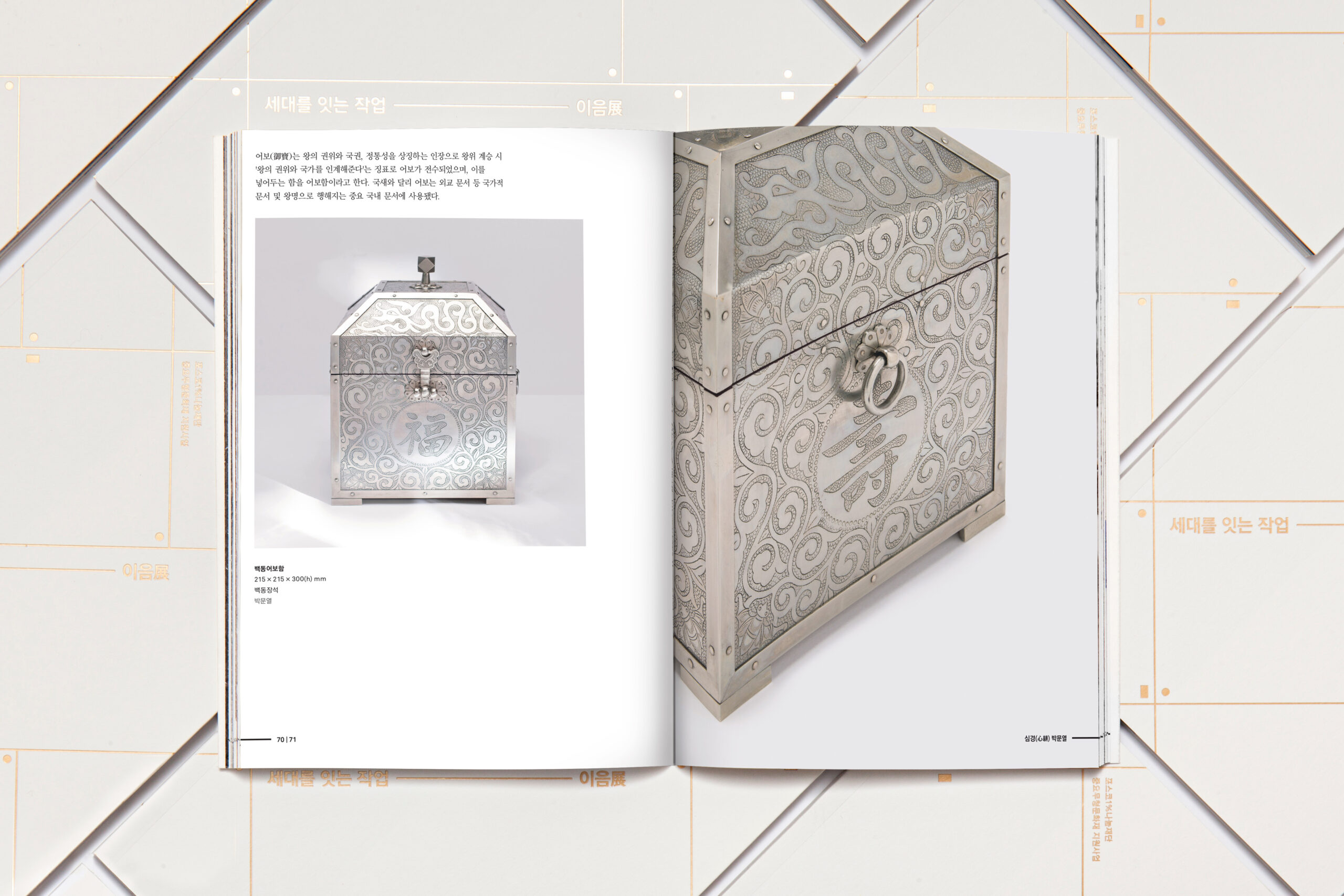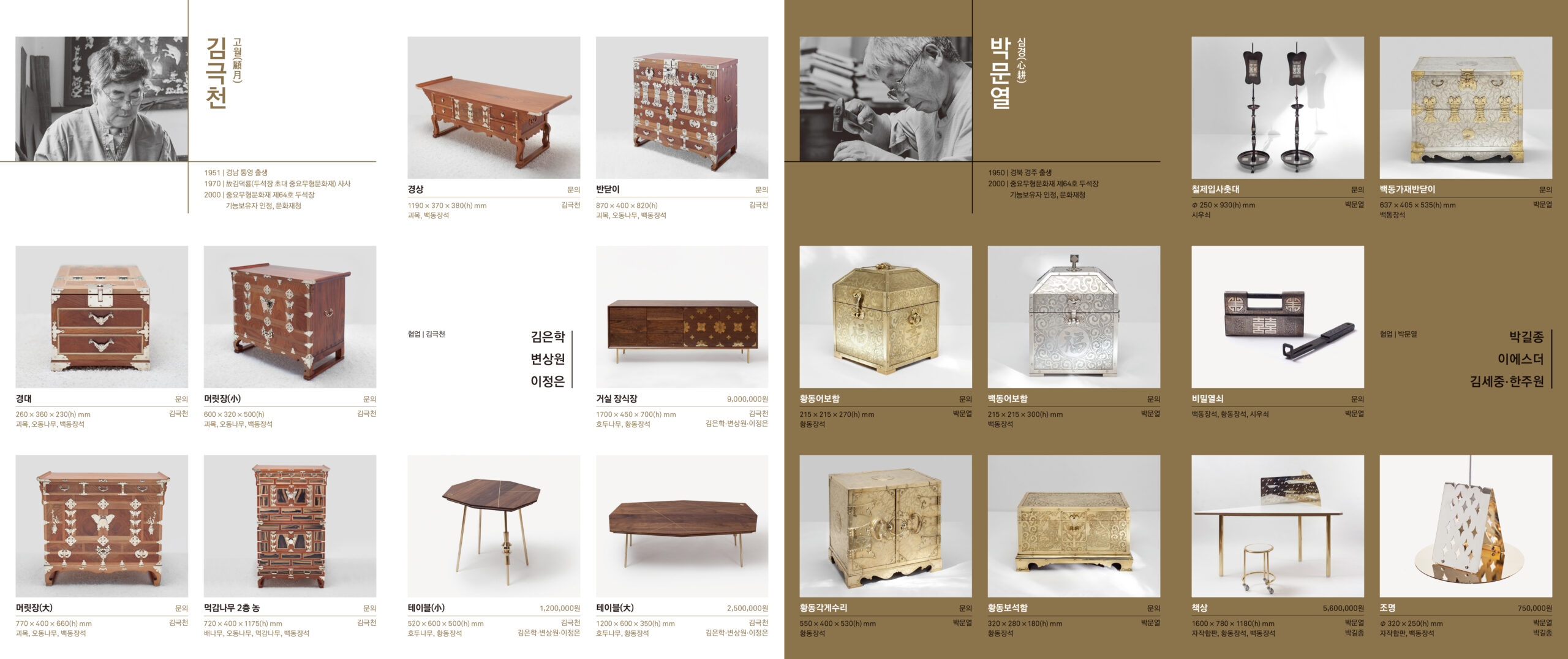 In the realm of metal crafts, the exhibition showcases works that revive the beauty of traditional crafts today, through collaboration between masters Dooseok-cheon Kim and Mun-yeol Park, and modern designers Se-joong Kim, Eun-hak Kim, Gil-jong Park, Sang-won Byun, Esther, Jeong-eun Lee, and Ju-won Han.